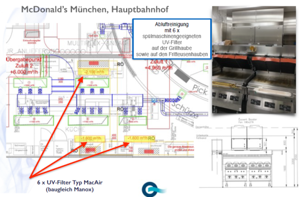Durch den Einsatz unserer UV-Technologie werden die Fettanteile der Abluft sicher und effektiv eliminiert und somit auch die Brandgefahr verringert. Und diese ist enorm, werden doch in gut gehenden Systemrestaurants wöchentlich bis zu 200 Liter Frittenöl verbraten. Davon verbleibt ein erheblicher Teil im Abluftkanal. Dieser müsste dann normalerweise in sehr kurzen Abständen (erforderlichenfalls wöchentlich) gereinigt werden. Macht natürlich niemand - weil unbezahlbar.